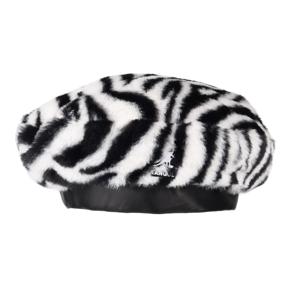 The Zebra Faux Fur Beret in black-white is an extremely comfortable beret from Kangol. It has an oversized fit in a plush faux fur and the Kangol logo is embroidered on the front. The band is finished in a faux leather for a great feel and will be a fantastic finishing touch to any outfit.