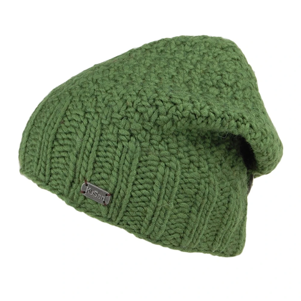 The Button Down Beanie Hat in green by Kusan is a hand made hat from the mountains of Nepal. The rear of the beanie is held down by a value and gives this hat a unique look. The inside of the hat features a fleece sweatband which is made from recycled plastic bottles. A metal Kusan badge is sewn to the bottom.