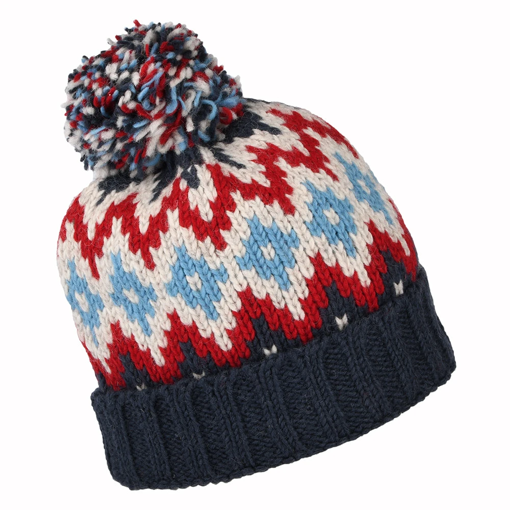 The Diamond Turn Up Bobble Hat in navy-red-cream from Kusan has been hand made in Nepal from 100% wool. The crown has a pretty diamond pattern and the hat has a turned up cuff and a small leather Kusan tag on the side. The inside features a fleece lining which is made from recycled plastic bottles.