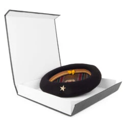 The Laulhère Authentique Ché Beret in black. This is the real deal – the exact same brand and style worn by Ché . Laulhère discovered that the famous Ché Guevara beret with the gold star was in fact one of the Laulhère “Vrai Basque” labels from the 50’s and 60’s. They managed to get access to the last beret he ever wore to not only confirm it was a Laulhère but also to help reproduce the exact beret. The lining was complicated to reproduce but the result is great. The leather headband is in a tan 100% leather with a yellow strip and they have also made a vintage antique gold colored metal star as a removable pin.