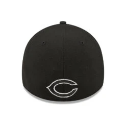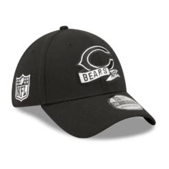 This New Era 39THIRTY NFL Sideline Chicago Bears baseball cap in black-white features the team logo embroidered on the front with a banner underneath with the team name as well as the conference the team is in, The NFC. The New Era flag is embroidered on the left side and the NFL league logo is embroidered on the right side. The team logo is embroidered at the back. As it is a 39THIRTY, the hat features a pre-curved brim and a sweatband that stretches for a perfect fit.