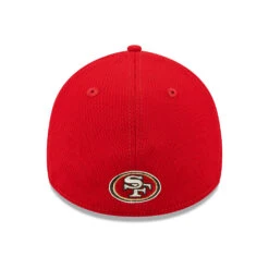 This San Francisco 49ers baseball cap in red is worn by the team while on the sideline during the game. The hat features the team logo embroidered on the front with a banner underneath with the team name as well as the conference the team is in, The NFC. The New Era flag is embroidered on the left side and the NFL league logo is embroidered on the right side. The team logo is embroidered at the back. As it is a 39THIRTY, the hat features a pre-curved brim and a sweatband that stretches for a perfect fit.