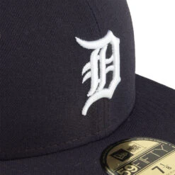 This cap has the Detroit Tigers logo in white on a navy crown. The MLB logo is embroidered on the back of the cap and the New Era logo on the side.