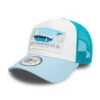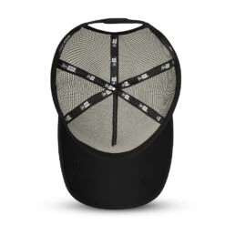 The New Era 9FORTY A-Frame Heritage Patch Trucker Cap in black features a New Era Buffalo Since 1920 patch sewn on the structured front and the New Era flag embroidered on the left side. The back of the cap features mesh panels for breathability and an adjustable snap for comfort.