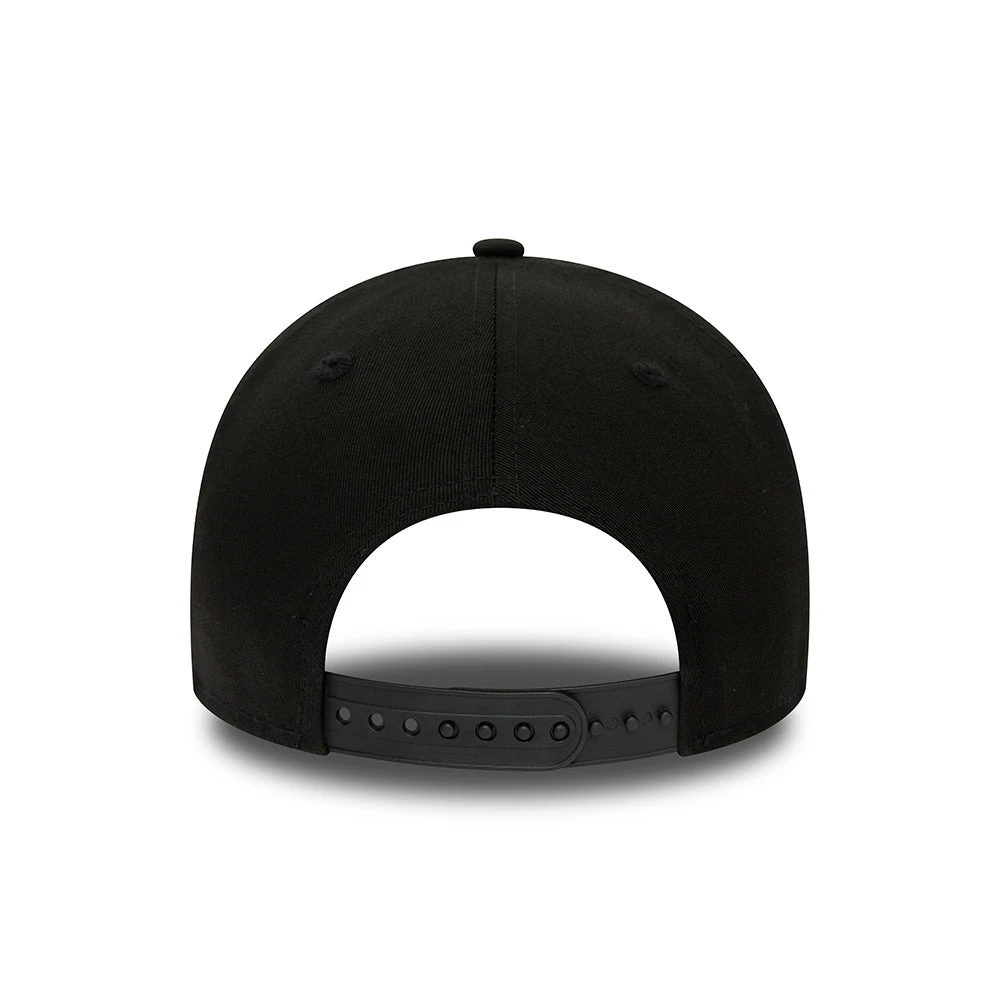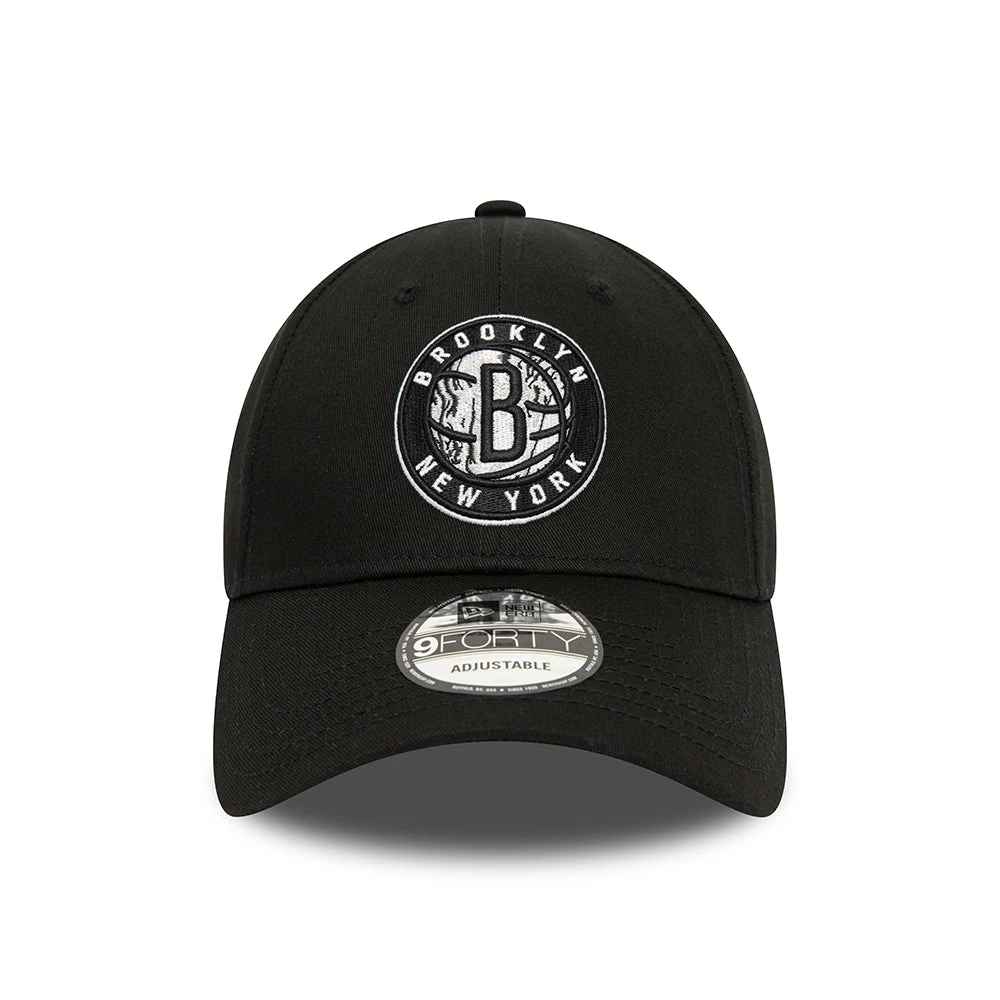 The New Era 9FORTY NBA Infill Brooklyn Nets Baseball Cap in black-grey features the team’s logo embroidered on the structured front panels and the New Era flag embroidered on the left side. The six panel cap is made of 100% cotton and features breathable eyelets with a curved visor and value on top. The open back has an adjustable cotton strap with metal buckle so the hat fits many sizes.
