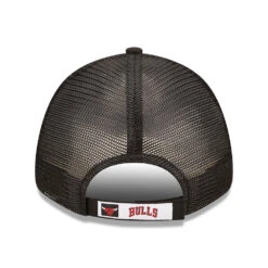 The New Era 9FORTY Chicago Bulls NBA Home Field Trucker Cap in black features the team logo embroidered on the structured cotton front panels. The New Era flag is embroidered on the left side. The back of the cap is in mesh for breathability and features an adjustable hook-and-loop strap for a great fit.