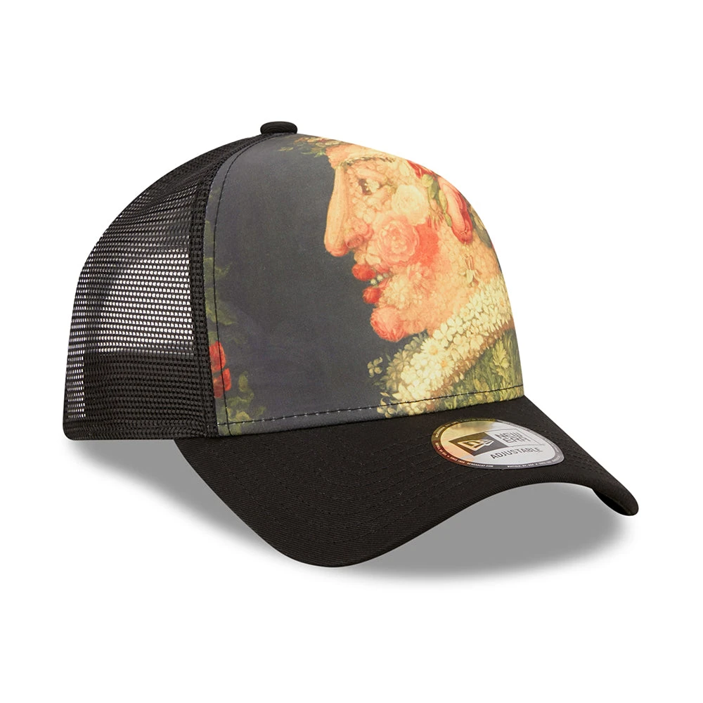 The 9FORTY Four Seasons Le Louvre AOP A-Frame Trucker Cap in black is the newest collaboration between New Era and the Louvre museum. This unique cap features Giuseppe Arcimboldo’s Four Season painting all over the structured front panel. The New Era flag is embroidered on the side and an adjustable snap at the back allows for a comfortable fit.