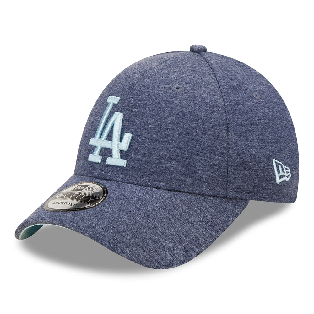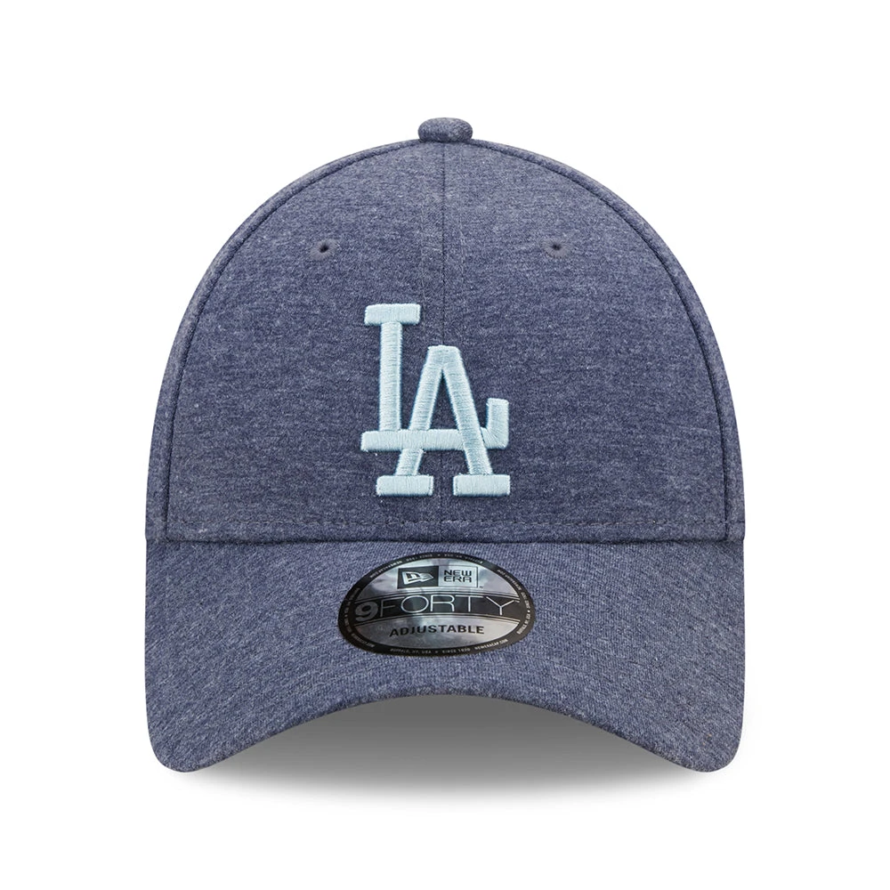 The 9FORTY L.A. Dodgers MLB Jersey Essential Baseball Cap in navy-light blue from New Era is made of a stretchy jersey fabric. The team logo is featured on the front and the New Era flag is embroidered on the left side of the cap. The six panel cap features breathable eyelets with a curved visor and value on top. The open back has an adjustable strap with metal buckle so the hat fits many sizes.