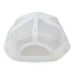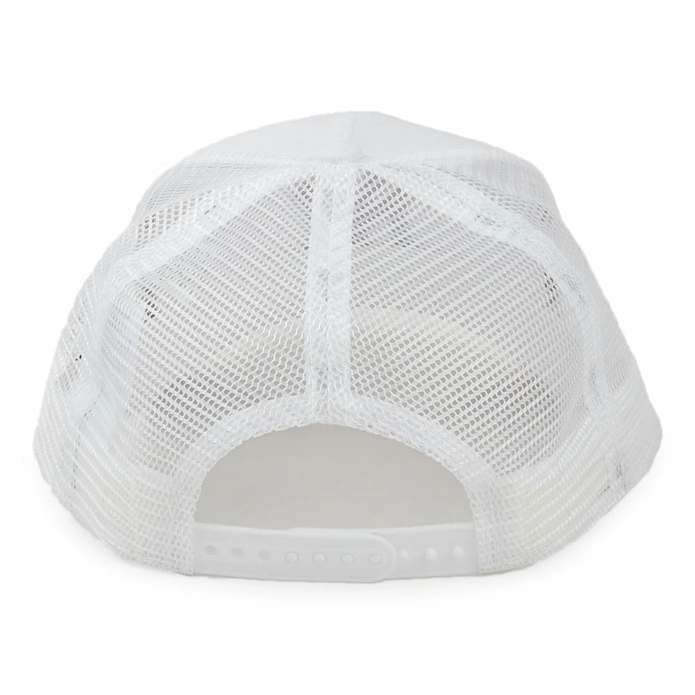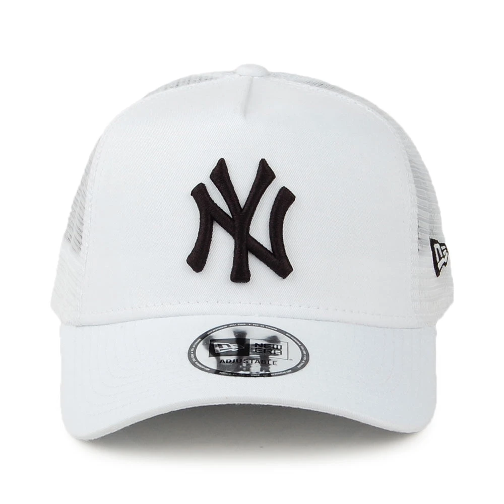 This is the New Era 9FORTY MLB League Essential New York Yankees A-Frame Trucker Cap in white-black. The cap features the team logo proudly embroidered on the structured front and a mesh back. The New Era flag is embroidered on the left side of the cap. It comes with a pre-curved brim and an adjustable snap at the back.