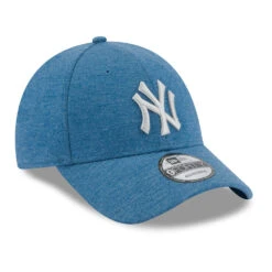 The 9FORTY New York Yankees MLB Jersey Essential Baseball Cap in azure-grey from New Era is made of a stretchy jersey fabric. The team logo is featured on the front and the New Era flag is embroidered on the left side of the cap. The six panel cap features breathable eyelets with a curved visor and value on top. The open back has an adjustable strap with metal buckle so the hat fits many sizes.