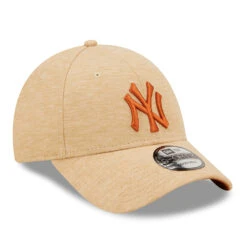 The 9FORTY New York Yankees MLB Jersey Essential Baseball Cap in stone-burnt orange from New Era is made of a stretchy jersey fabric. The team logo is featured on the front and the New Era flag is embroidered on the left side of the cap. The six panel cap features breathable eyelets with a curved visor and value on top. The open back has an adjustable strap with metal buckle so the hat fits many sizes.