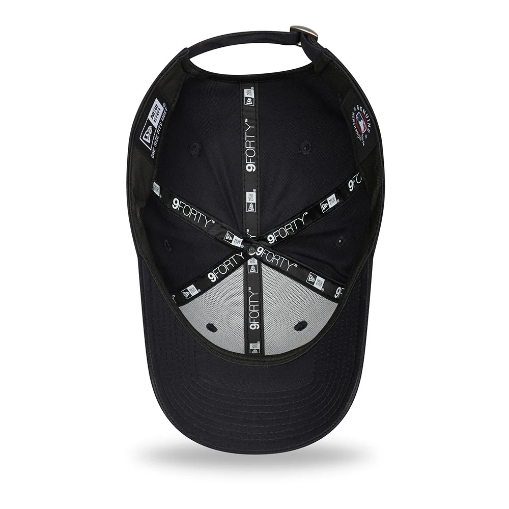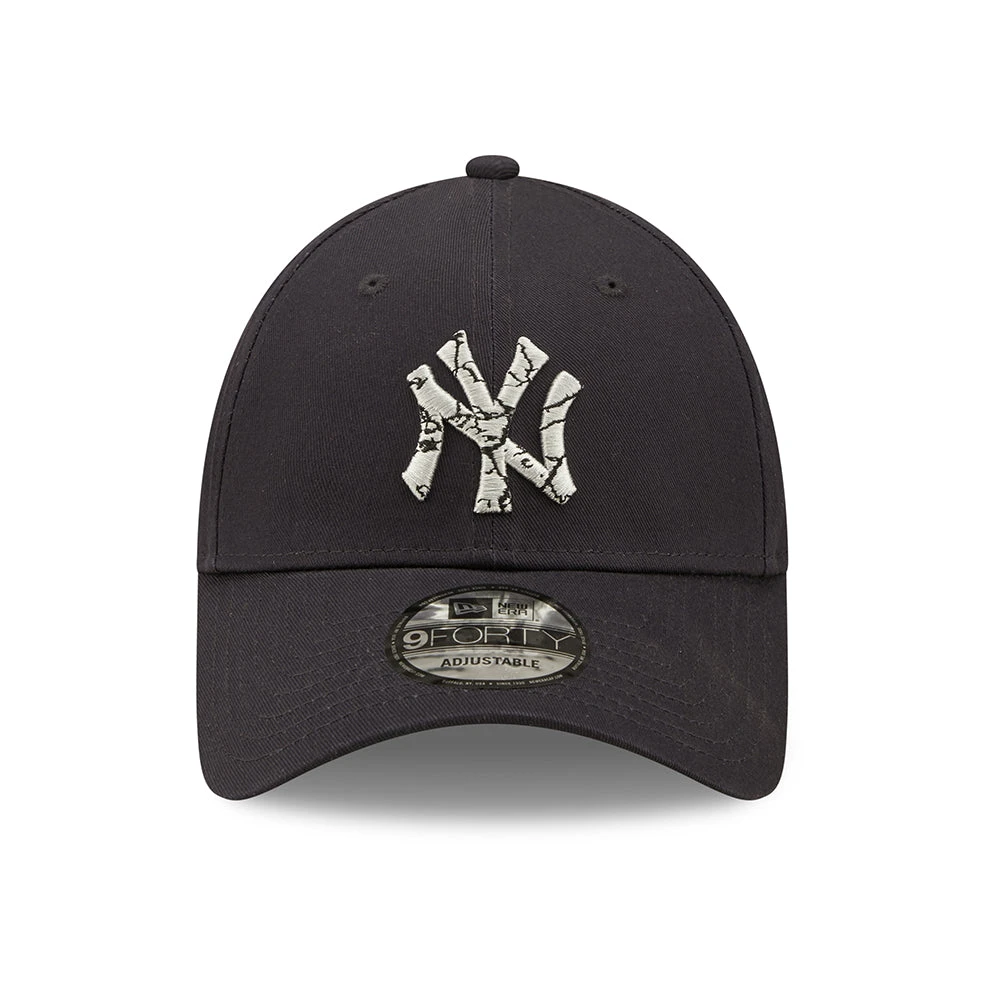 The New Era 9FORTY New York Yankees MLB Marble Infill Baseball Cap in navy blue features the team’s logo embroidered on the structured front panels and the New Era flag embroidered on the left side. The six panel cap is made of 100% cotton and features breathable eyelets with a curved visor and value on top. The open back has an adjustable cotton strap with metal buckle so the hat fits many sizes.