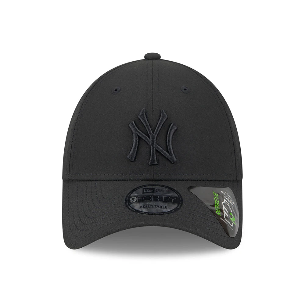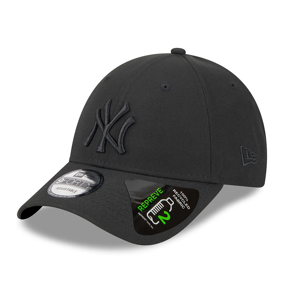 The 9FORTY MLB Repreve Outline New York Yankees Baseball Cap from New Era in black on black features the team’s logo embroidered on the structured front panels and the New Era flag embroidered on the left side. It is made of 100% recycled fabric from plastic bottles and comes with a curved brim and eyelets for ventilation. There is an adjustable strap at the back for easy sizing.