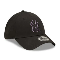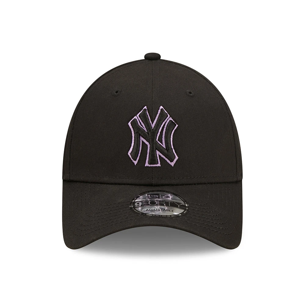 The 9FORTY New York Yankees MLB Team Outline Baseball Cap in black-purple from New Era is made of 100% cotton. The team logo is featured on the structured front and the New Era flag is embroidered on the left side of the cap. The six panel cap features breathable eyelets with a curved visor and value on top. The open back has an adjustable strap with metal buckle so the hat fits many sizes.