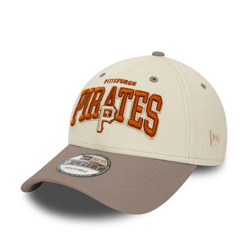 The 9FORTY MLB White Crown Pittsburgh Pirates Baseball Cap in ivory-taupe from New Era is made of 100% cotton. The team logo is featured on the structured front and the New Era flag is embroidered on the left side of the cap. The six panel cap features breathable eyelets with a curved visor and value on top. The open back has an adjustable strap with metal buckle so the hat fits many sizes.