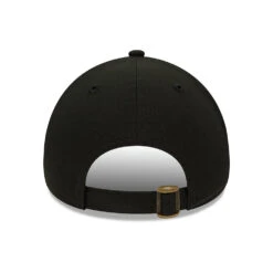 The 9FORTY New World Repreve Baseball Cap from New Era in black features a New Era patch sewn on the structured front panels and the New Era flag embroidered on the left side. It is made of 100% recycled fabric from plastic bottles and comes with a curved brim and eyelets for ventilation. The open back has an adjustable strap with metal buckle so the hat fits many sizes.
