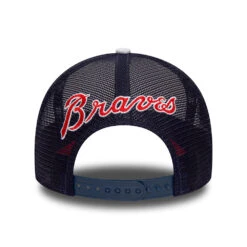 The New Era MLB Logo Atlanta Braves A-Frame Trucker Cap in white-scarlet-navy features the team logo on the padded front panel and the New Era flag embroidered on the left side. The team name is embroidered above the adjustable snap at the back.