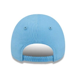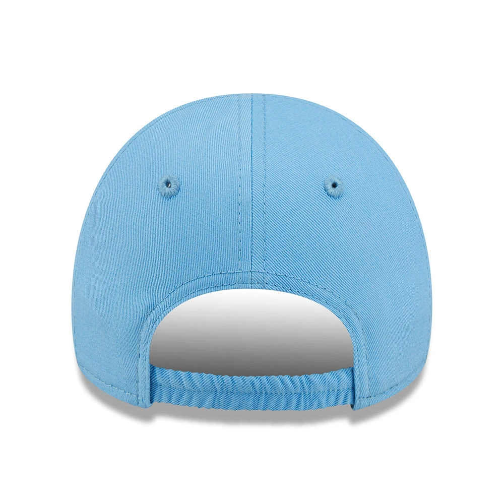 The New Era Baby 9FORTY MLB League Essential L.A. Dodgers Baseball Cap in sky blue-white features the team logo embroidered on the cotton front and the New Era flag embroidered on the left. An elasticized strap at the back allows a comfortable fit.