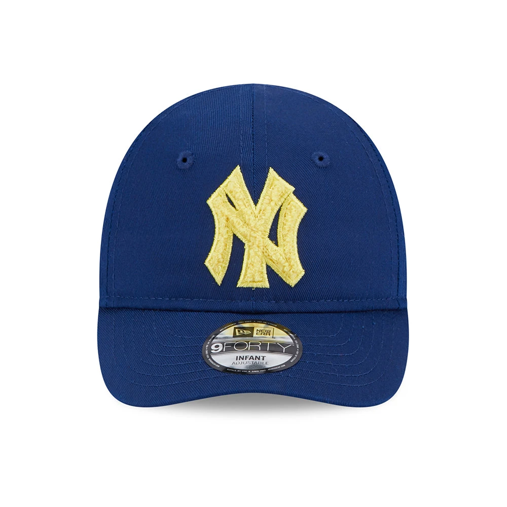 This adorable New Era Baby 9FORTY MLB Boucle New York Yankees Baseball Cap in blue-yellow features the team logo embroidered on the front and the New Era flag embroidered on the left. The crown in cotton features eyelets for breathability and an elasticized strap at the back allows a comfortable fit.