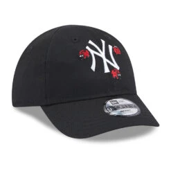 This adorable New Era Baby 9FORTY MLB Outdoor New York Yankees Baseball Cap in black-white features the team logo embroidered on the front with ladybirds crawling around it. The New Era flag embroidered on the left. The crown features eyelets for breathability and an elasticized strap at the back allows a comfortable fit.