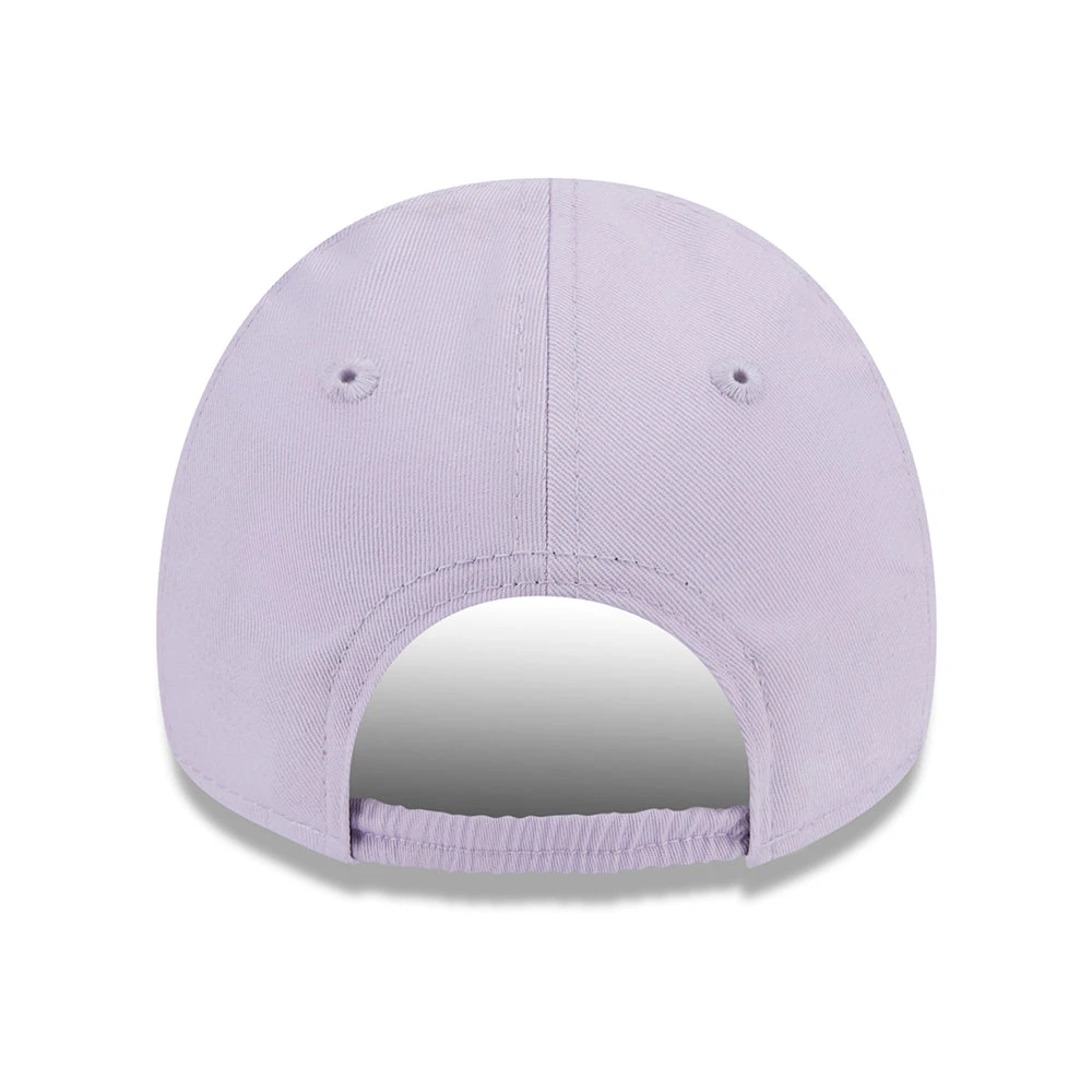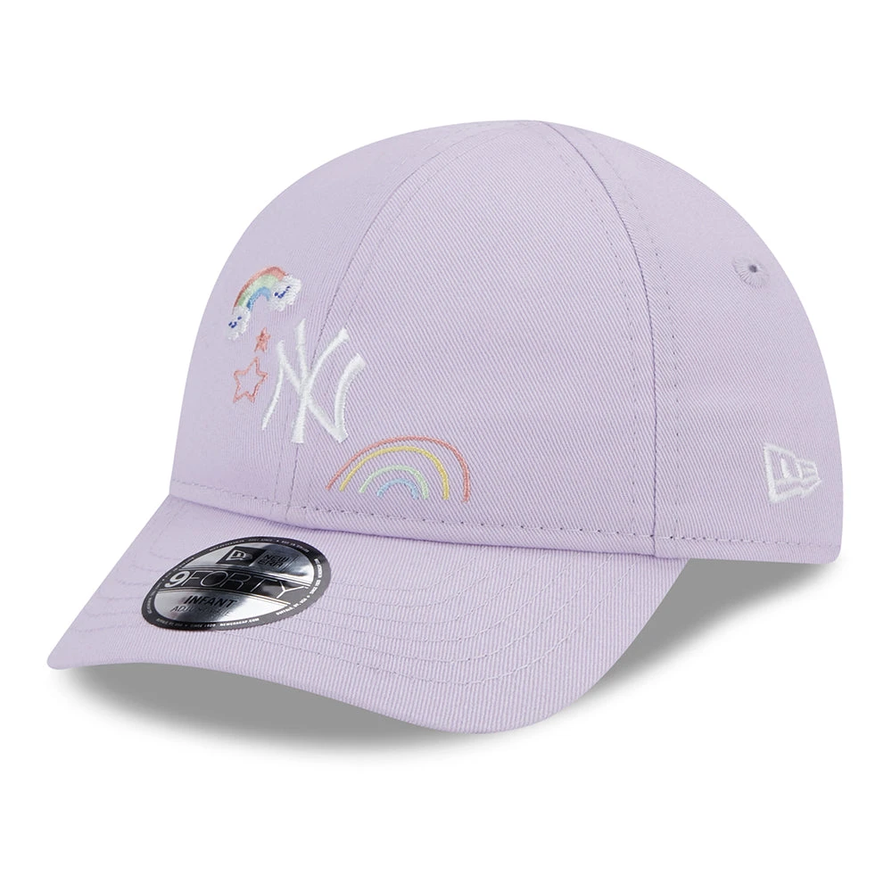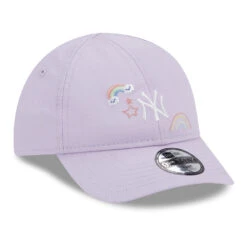 This adorable New Era Baby 9FORTY MLB Starry New York Yankees Baseball Cap in lavender features the team logo and cute sky themed embroideries on the slightly structured front panels. The New Era flag is embroidered on the left side of the cap. The crown in cotton features eyelets for breathability and an elasticized strap at the back allows a comfortable fit.