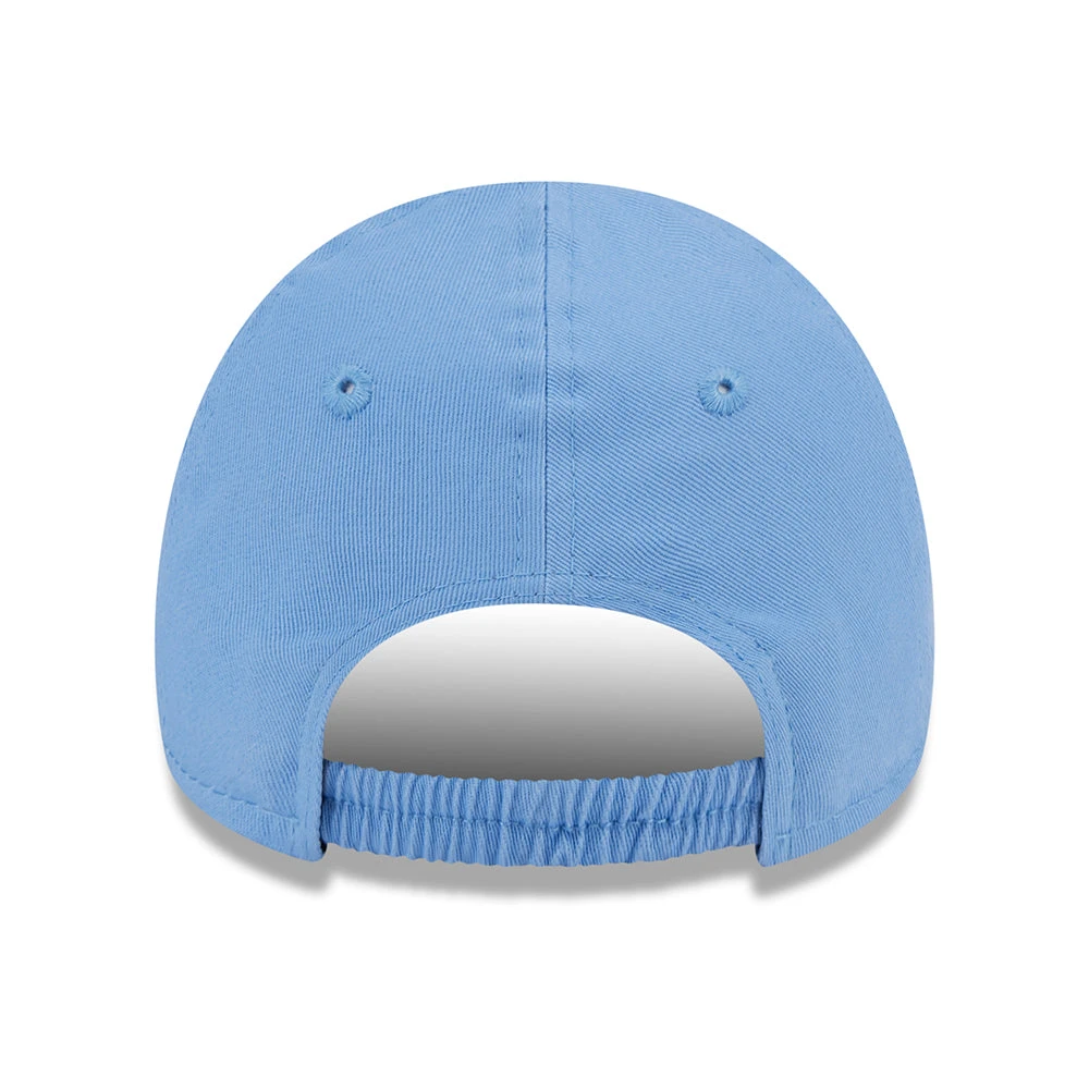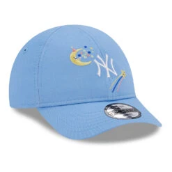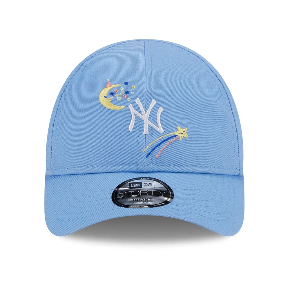 This adorable New Era Baby 9FORTY MLB Starry New York Yankees Baseball Cap in sky blue features the team logo and cute sky themed embroideries on the slightly structured front panels. The New Era flag is embroidered on the left side of the cap. The crown in cotton features eyelets for breathability and an elasticized strap at the back allows a comfortable fit.