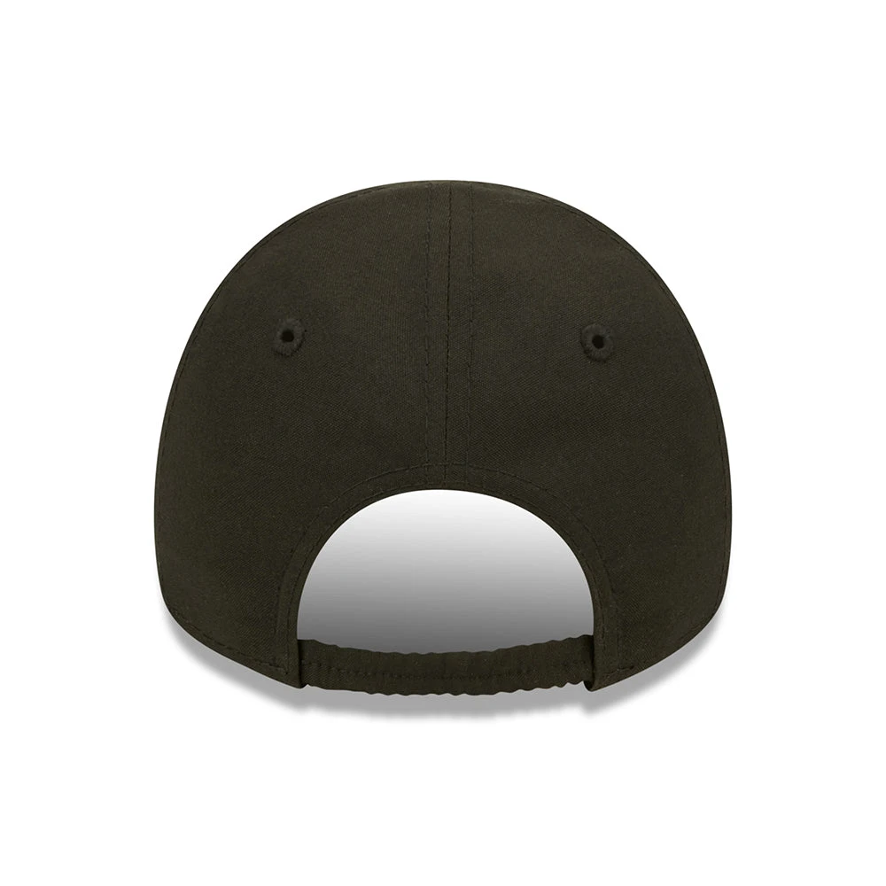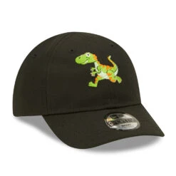 The New Era Baby 9FORTY Dino Repreve Baseball Cap in black is made of 100% recycled fabric from plastic bottles. This adorable baseball cap features a dinosaur embroidered on the front and the New Era flag embroidered on the left side. An elasticized strap at the back will allow a comfortable fit.
