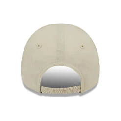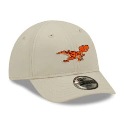The New Era Baby 9FORTY Dino Repreve Baseball Cap in stone is made of 100% recycled fabric from plastic bottles. This adorable baseball cap features a dinosaur embroidered on the front and the New Era flag embroidered on the left side. An elasticized strap at the back will allow a comfortable fit.