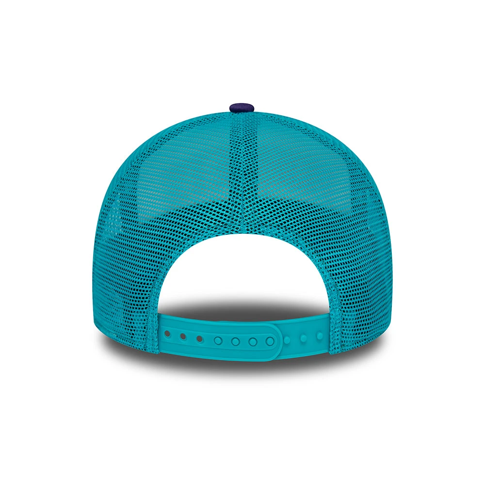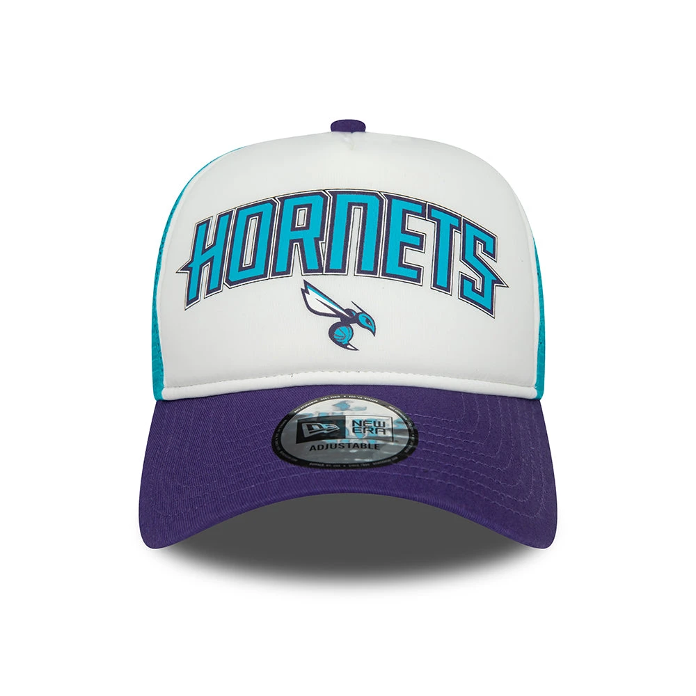 The New Era NBA Retro Charlotte Hornets A-Frame Trucker Cap in white-purple-teal features a padded front with a retro team logo in the middle. The New Era flag is embroidered on the left side of the cap. There is an adjustable snap at the back of the cap for a great fit.