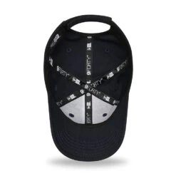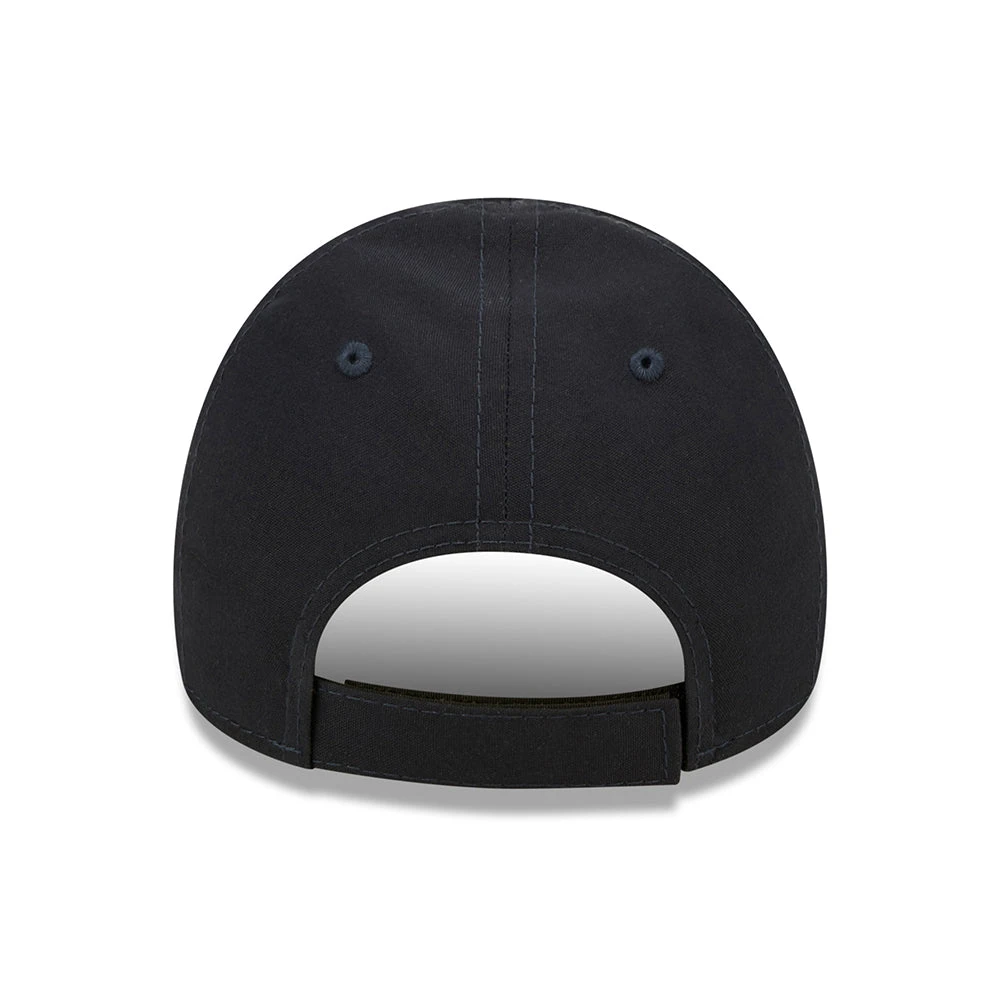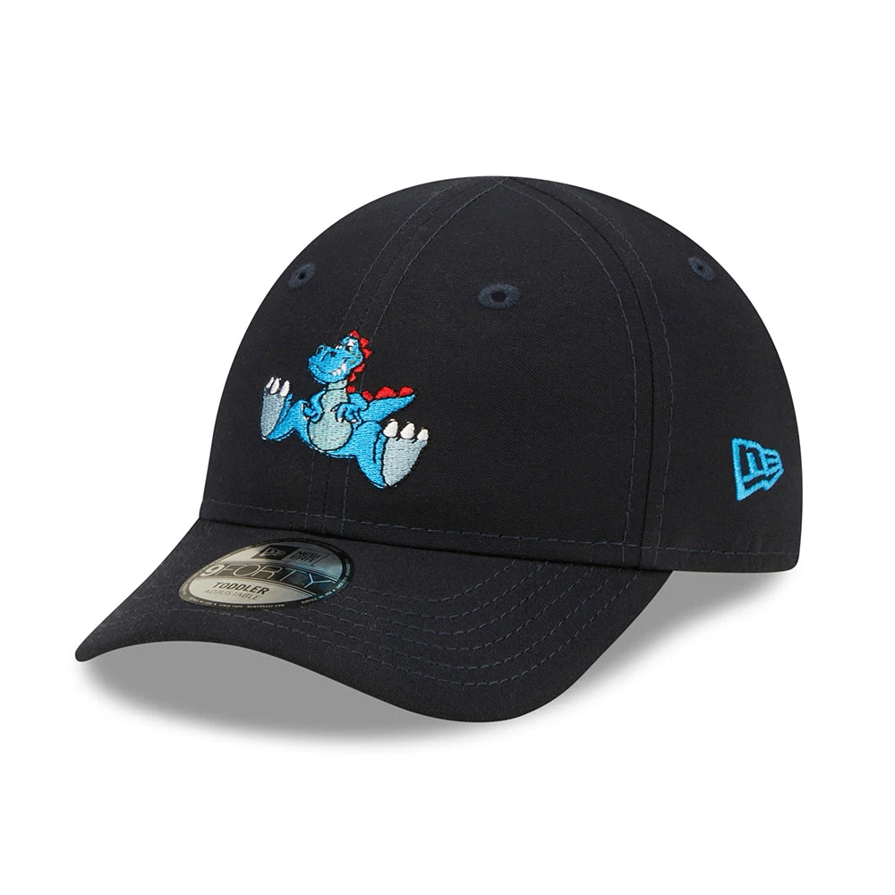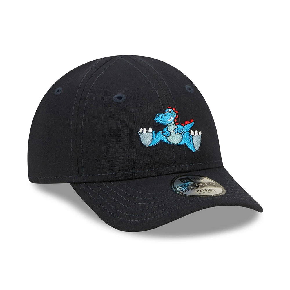 The New Era Kids 9FORTY Dino Repreve Baseball Cap in navy blue is made of 100% recycled fabric from plastic bottles. This adorable baseball cap features a dinosaur embroidered on the front and the New Era flag embroidered on the left side. An adjustable hook-and-loop strap at the back will allow a comfortable fit.