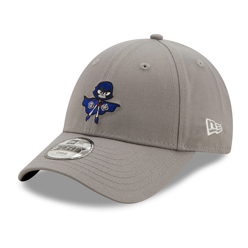 The New Era Kids 9FORTY Teen Titan Raven Baseball Cap – Titan Character in grey features Raven, one the main characters of the Teen Titans, embroidered on the structured front panels. The New Era logo is embroidered on the side and there is an adjustable strap at the back that should allow this hat to fit your young one’s head.