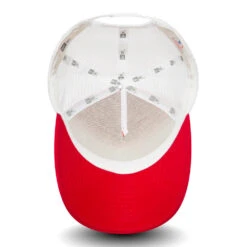 Here is the New Era New York Yankees MLB Clean Trucker A-Frame Trucker Cap in red. The cap has a structured cotton front with the team logo embroidered and a mesh back. The New Era flag is embroidered on the left side of the cap. It comes with a pre-curved brim and an adjustable snap at the back for a comfortable fit.