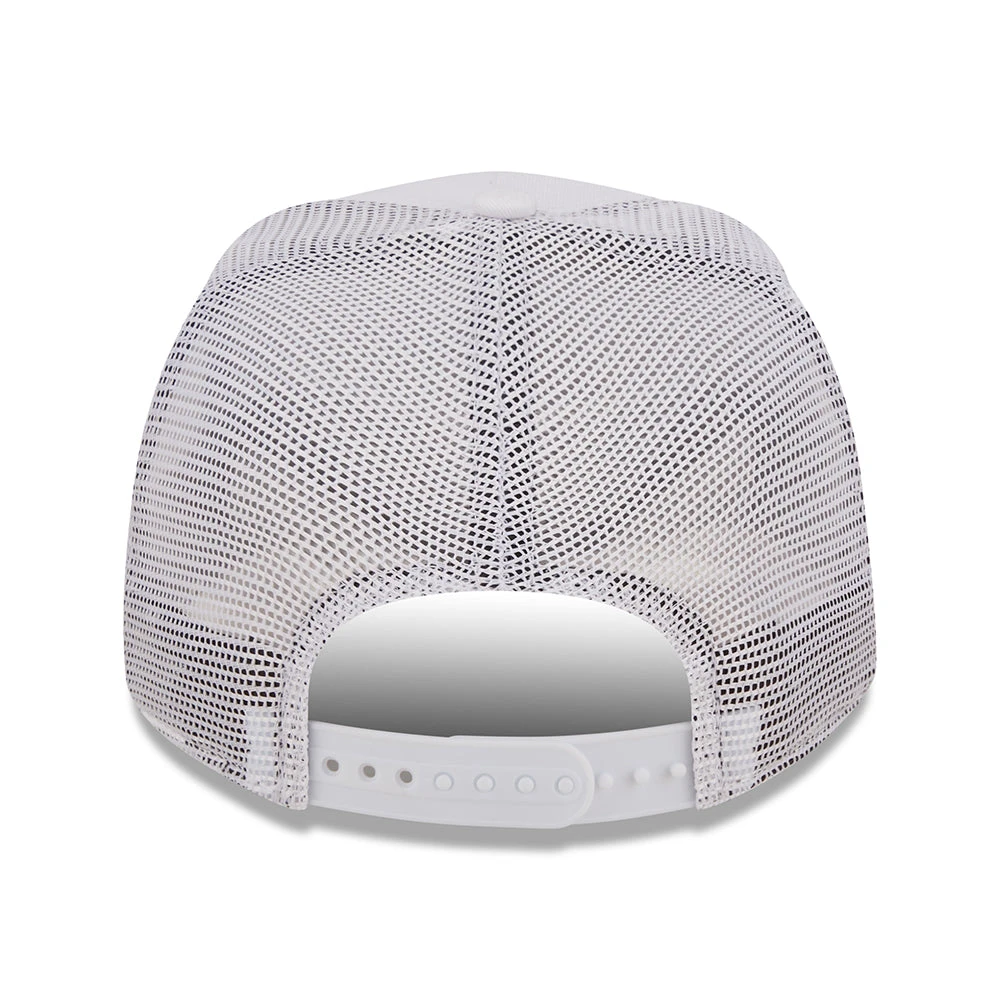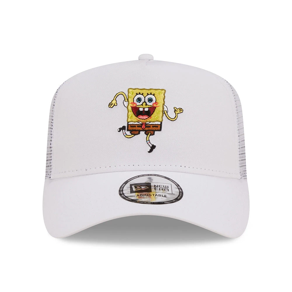 The Sponge Bob SquarePants Nickelodeon A-Frame Trucker Cap in white from New Era features SpongeBob embroidered on the structured front panel and the New Era flag on the left side. It comes with a pre-curved brim and mesh back for ventilation. There is an adjustable snap at the back for easy sizing.