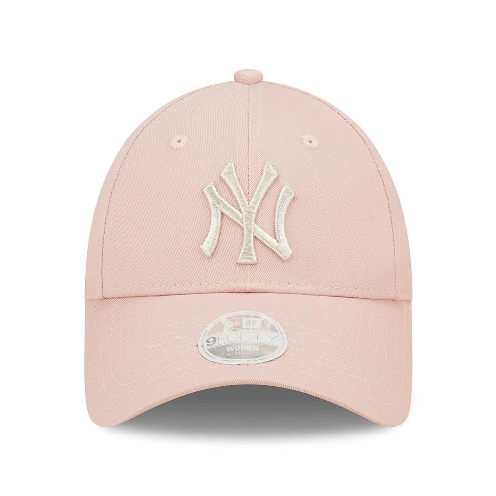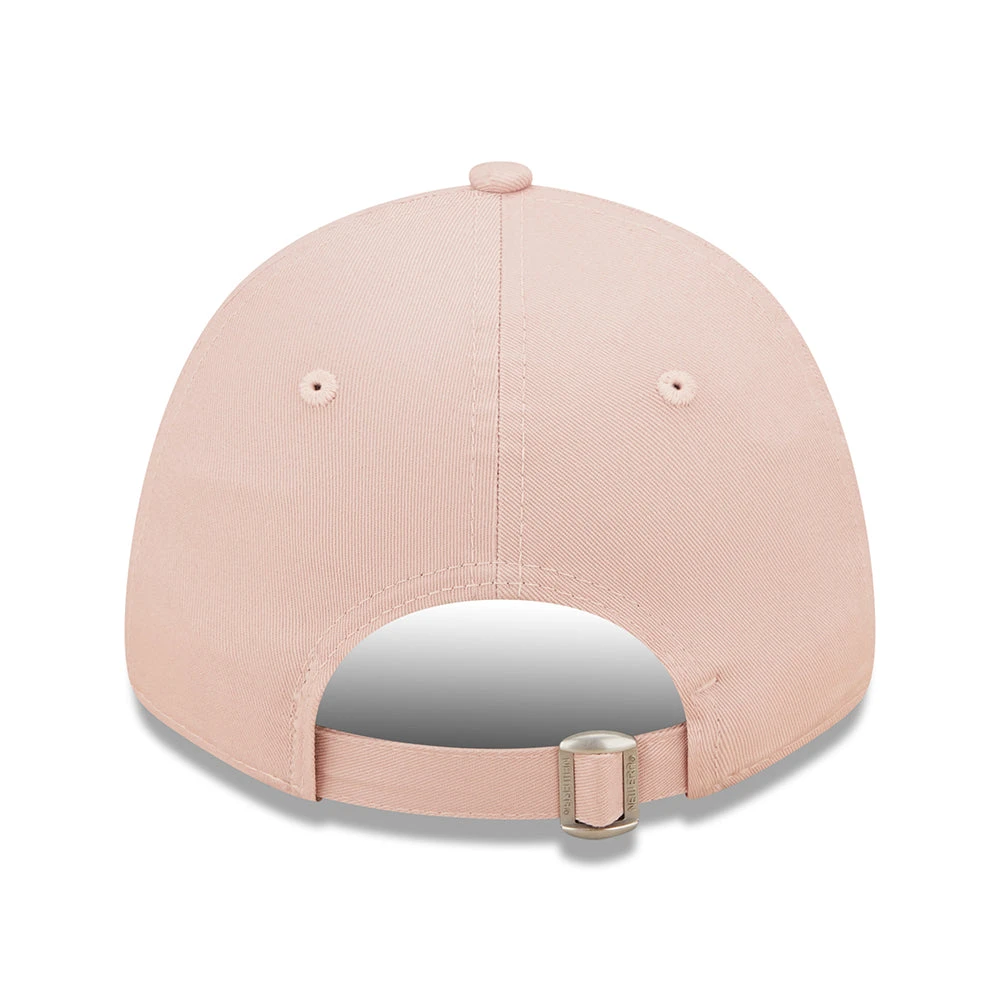 The New Era Women’s 9FORTY MLB Metallic Logo New York Yankees Baseball Cap in light pink-silver features the team’s logo embroidered on the structured front panels of the cap and the New Era flag is embroidered on the left side. The six panel cap is made of 100% cotton and features breathable eyelets with a curved visor and value on top. The open back has an adjustable cotton strap with metal buckle so the hat fits many sizes.