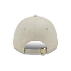 The New Era Women’s 9FORTY MLB Metallic Logo New York Yankees Baseball Cap in stone-gold features the team’s logo embroidered on the structured front panels of the cap and the New Era flag is embroidered on the left side. The six panel cap is made of 100% cotton and features breathable eyelets with a curved visor and value on top. The open back has an adjustable cotton strap with metal buckle so the hat fits many sizes.