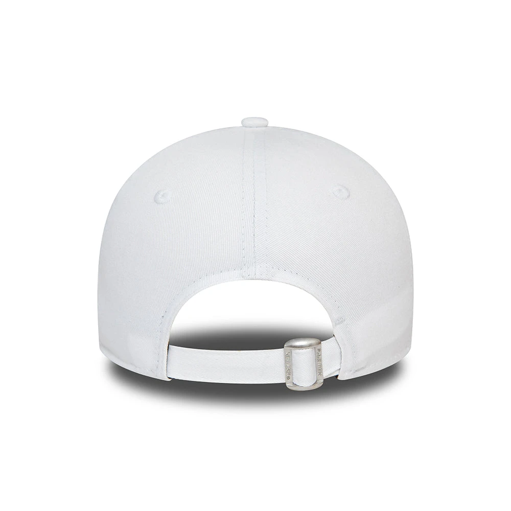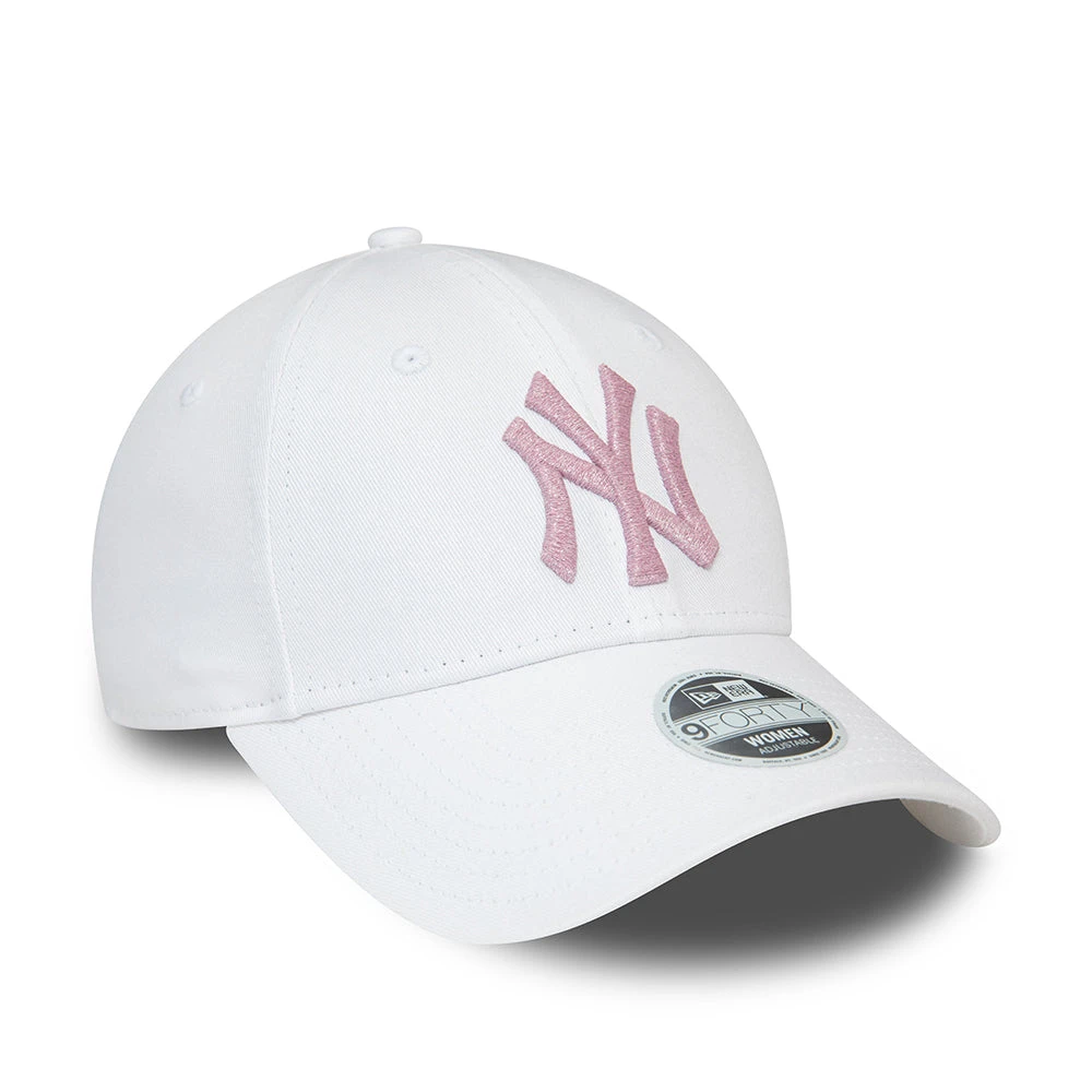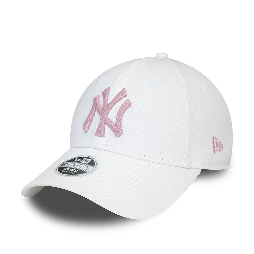 The New Era Women’s 9FORTY MLB Metallic Logo New York Yankees Baseball Cap in white-pink features the team’s logo embroidered on the structured front panels of the cap and the New Era flag is embroidered on the left side. The six panel cap is made of 100% cotton and features breathable eyelets with a curved visor and value on top. The open back has an adjustable cotton strap with metal buckle so the hat fits many sizes.