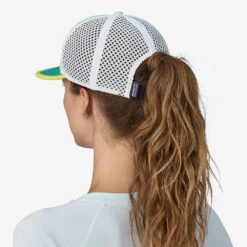 The Patagonia Duckbill Shorty Trucker Cap in mint-teal-white is a Fair Trade Certified™ trucker cap made with 100% recycled materials. It provides the coverage of a baseball cap with a mesh back that helps dissipate heat. This cap features a Patagonia logo on the front towards the side and a Patagonia flip tag at the back. On the inside is a HeiQ Mint sweatband for odour control and a strap at the back adjusts to fit most sizes. The packable foam brim folds into a pocket for easy packing, then rebounds to its original shape.