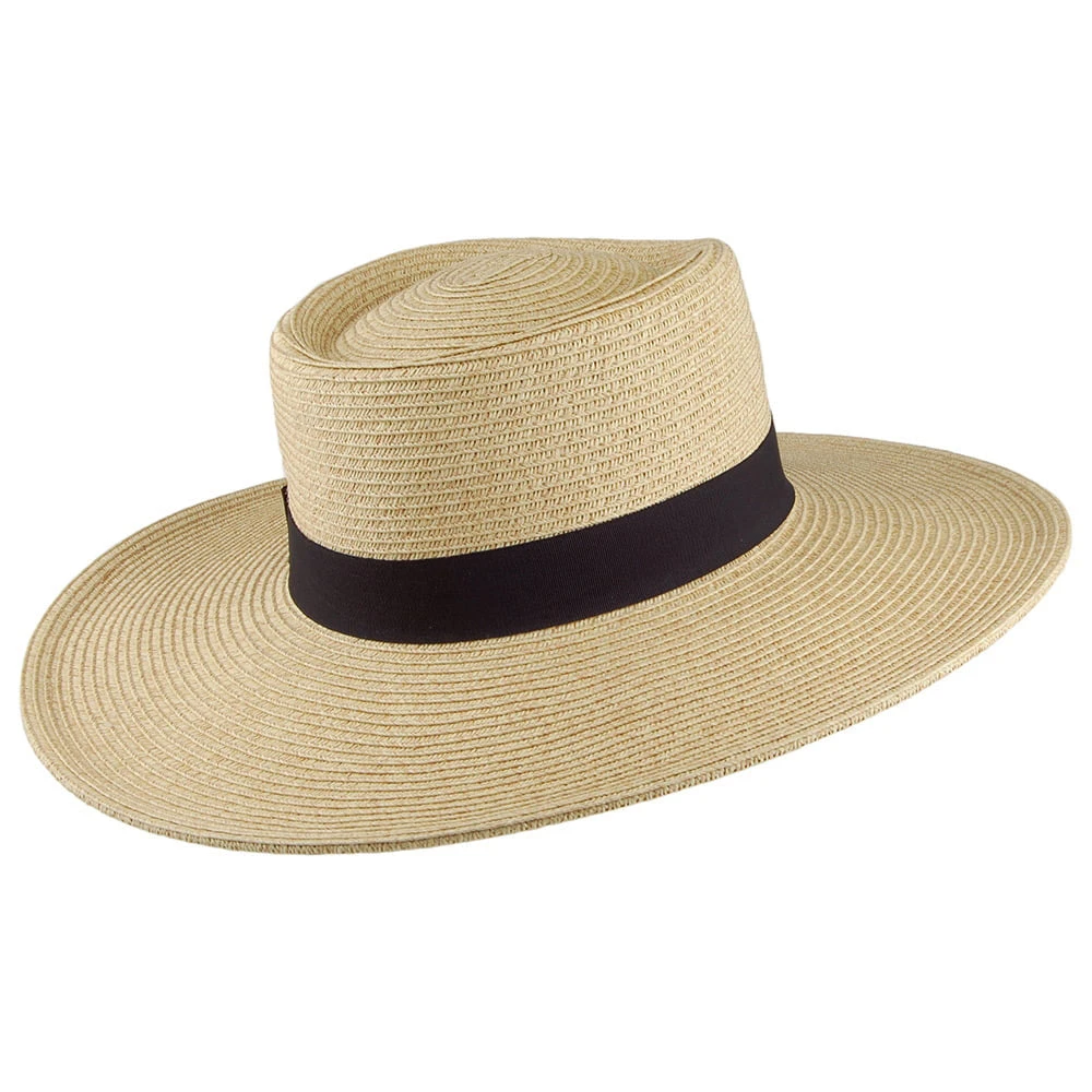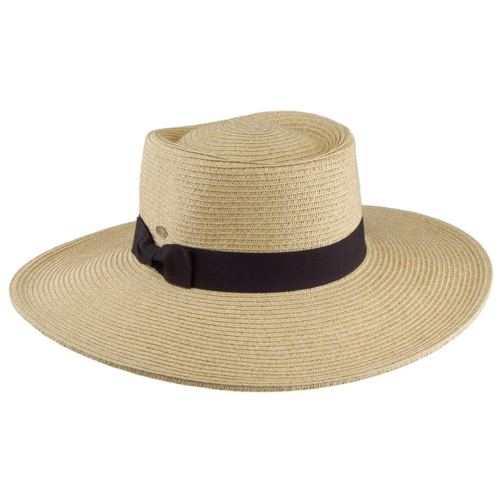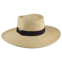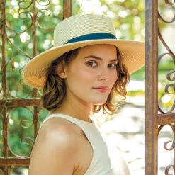 The Scala Big Brim Toyo Straw Sun Hat in natural has a lovely grosgrain hatband around the hat that makes it simple and unique from the other sun hats. The hat has a metallic Scala tag attached to the side and the brim measures approximately 9.5cm wide.
