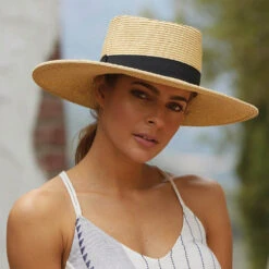 The Scala Big Brim Toyo Straw Sun Hat in toast has a lovely grosgrain hatband around the hat that makes it simple and unique from the other sun hats. The hat has a metallic Scala tag attached to the side and the brim measures approximately 9.5cm wide.