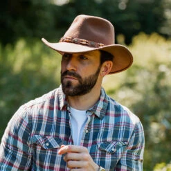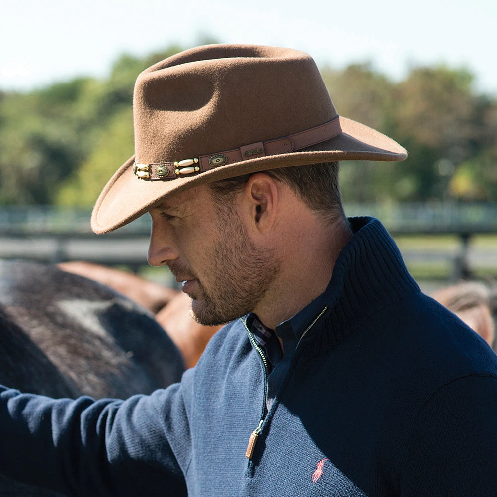 The Scala Knoxville Crushable Wool Felt Outback in pecan is a fine hat! The leather band with beads around the crown gives this hat a classic rustic vibe. The brim measures approximately 7.5cm wide at the front and back, while the sides are slight shorter at 7cm. A cotton sweatband inside the hat makes this very comfortable to wear.