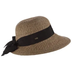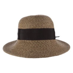 The Scala Straw Sun Hat with Grosgrain Bow in natural-black is an elegant summer hat for women which will be perfect for the hot sunny days thanks to its UPF 50+ sun protection. The brim towards the front measures 9cm wide which provides a vast amount of shade while the back measures 5cm wide in order to not be too cumbersome. The grosgrain hat band is tied into a bow at the back. The hat is unlined and features an elastic sweatband using the COOLMAX® technology, which is engineered to keep you cool and dry.