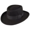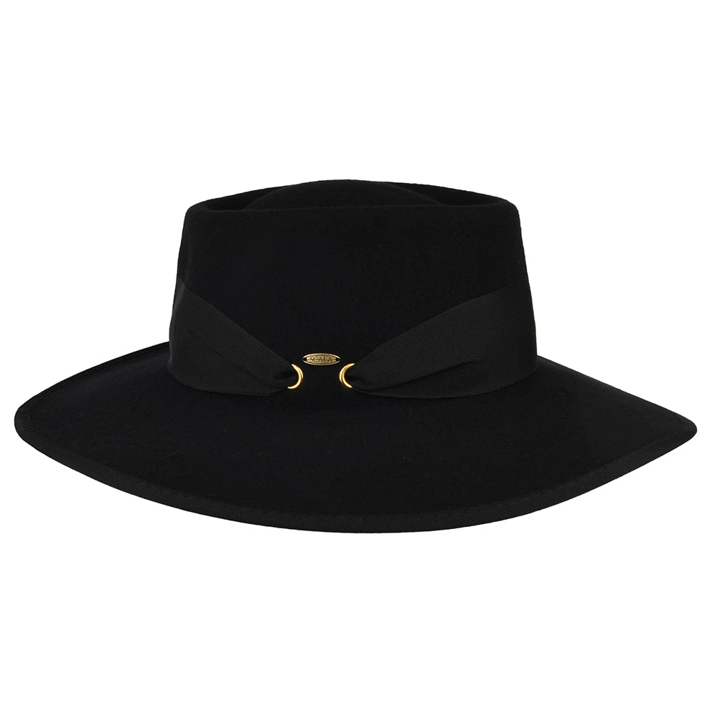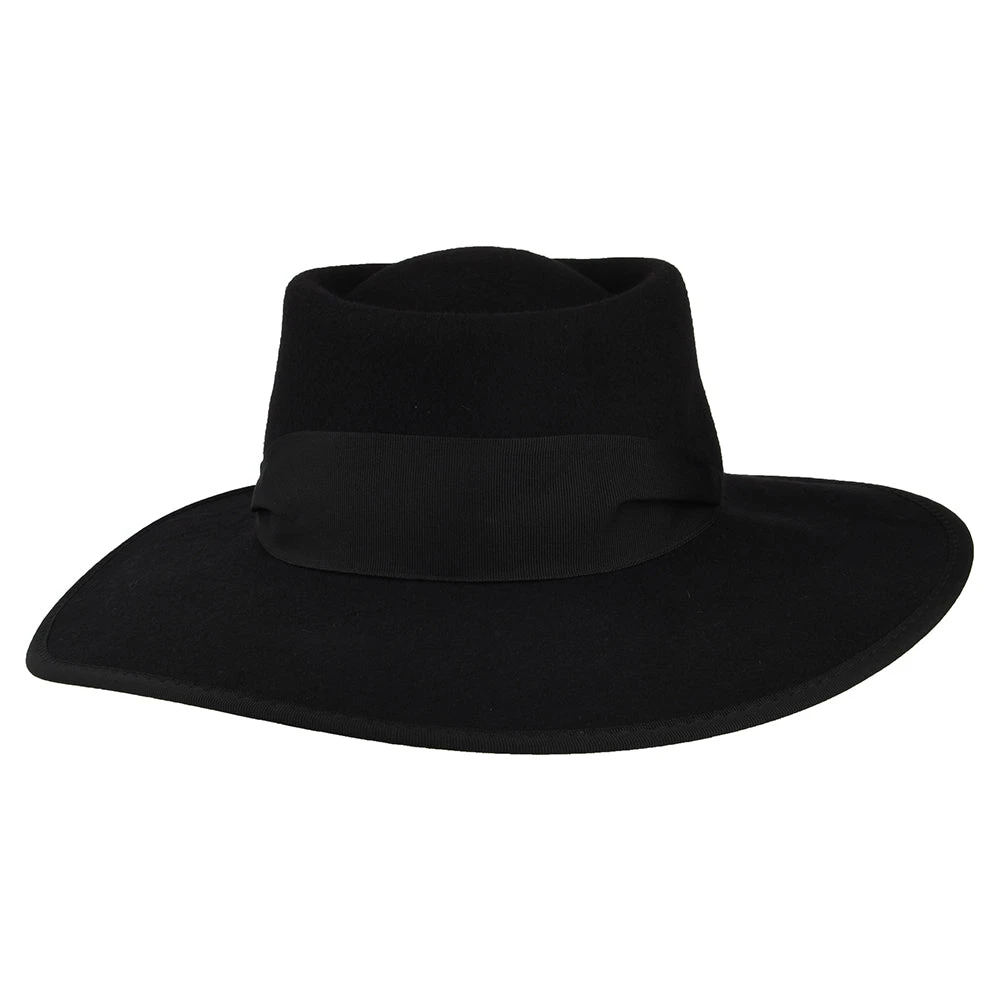 This new Gaucho hat in black is made from 100% wool felt. Also called Bolero Hats, Gaucho Hats were originally worn by cowboys in South America. This stunning gaucho hat has a wide brim and a UPF 50+ rating, so it is a great sun protector. It features a wide grosgrain hat band and a small Scala pin sewn on the side. The hat is unlined and features a grosgrain sweatband with an adjustable drawstring for easy sizing.
