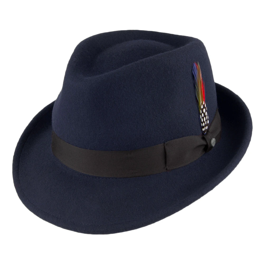 Stetson really knows how to make a trilby and the Elkader in navy blue is no exception. The 100% wool felt hat has a 2 inch pre-snap brim in the front and 1 1/2 inch wide rolled brim in the back. The crown is 4 inches high.