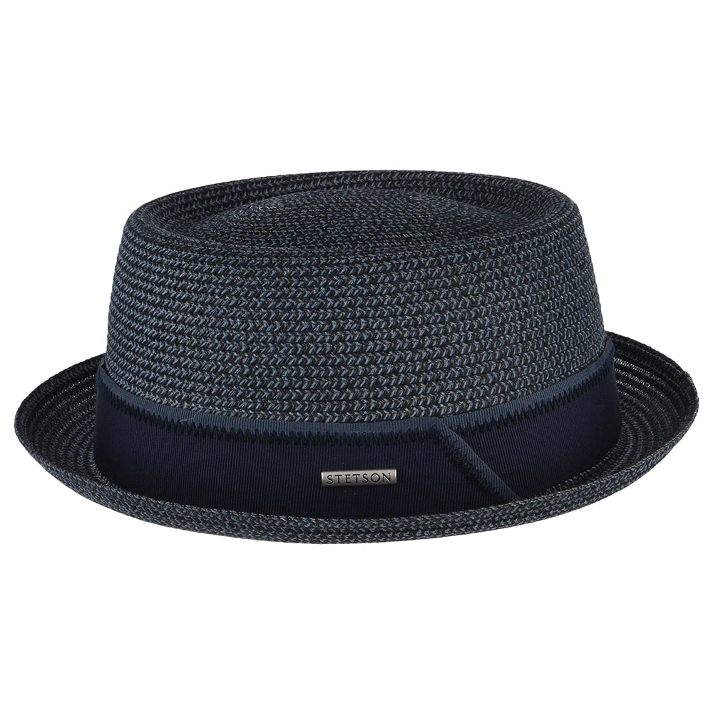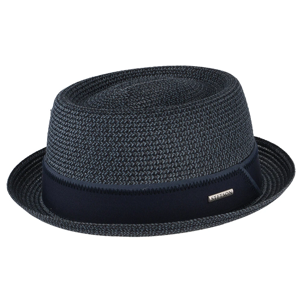 The Toyo Straw Pork Pie Hat in blue is a fantastic new summer style from Stetson. The hat features a unique two-tone grosgrain hat band giving a great look. There is a Stetson pin on the side. The hat is unlined and features a cotton sweatband for a comfortable fit.