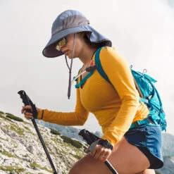 The Sunday Afternoons Adventure Sun Hat in blue is Sunday Afternoons most famous style. It is a great lightweight outdoor hat. It is made of a light and comfortable nylon that is UPF 50+ rated, as well as water and stain resistant. There are mesh sides that help with ventilation. There is a long neck cape at the back and an adjustable chin cord to keep that hat on.