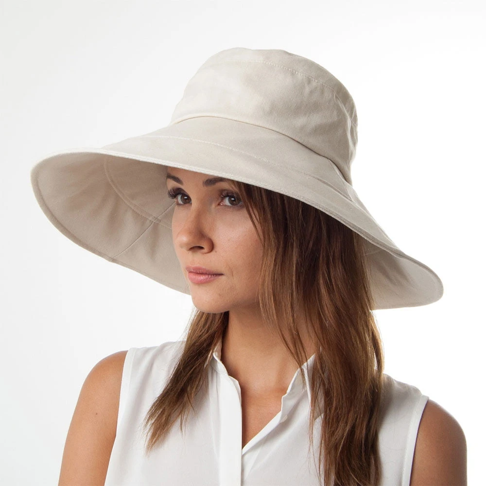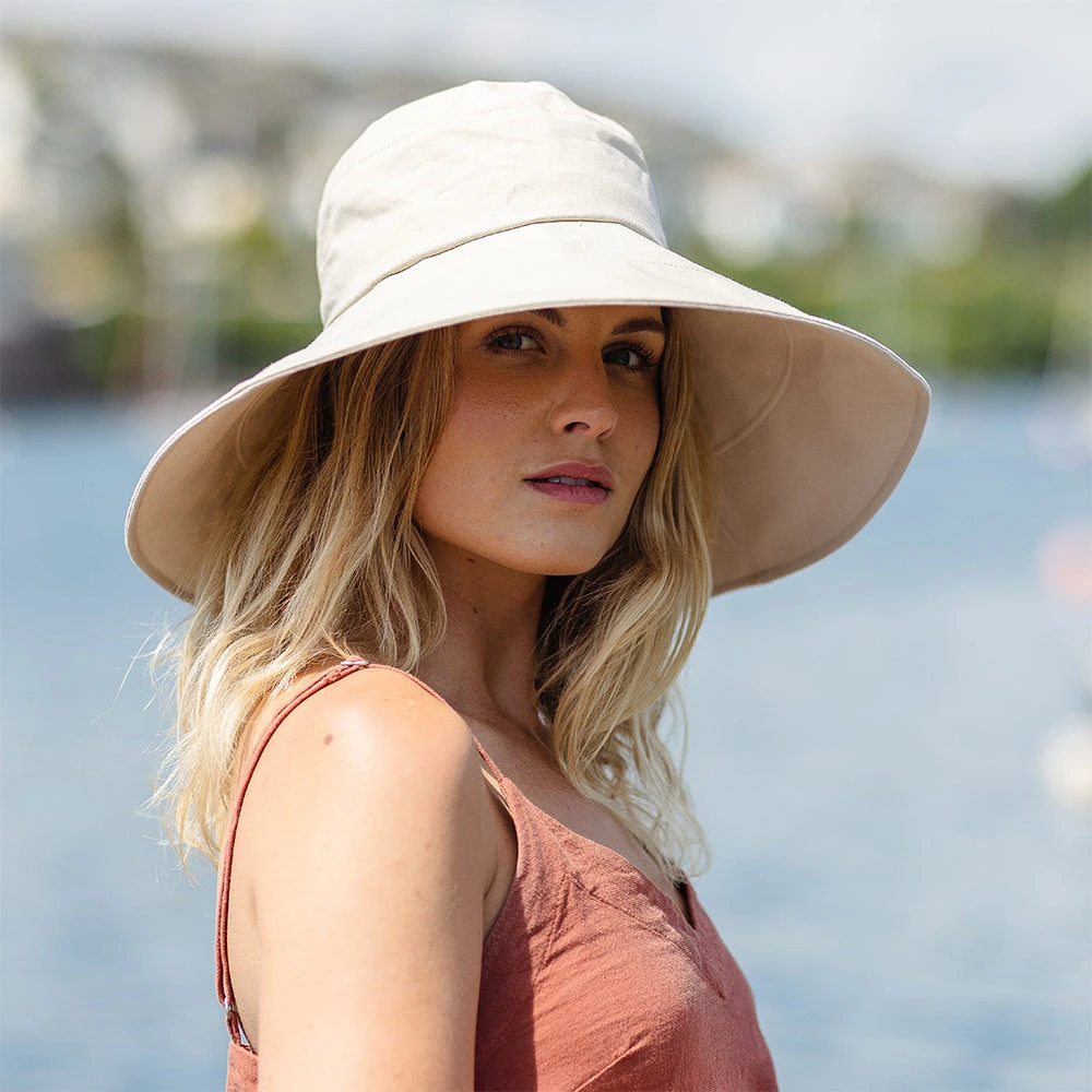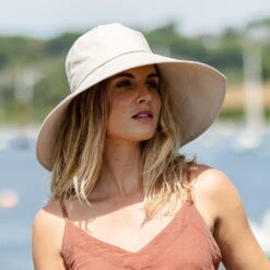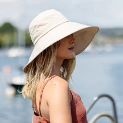 The Monaco Sunhat in beige from sur la tête is a great hat for the rocky beaches along the Mediterranean or when sitting at the café sipping your aperitif. Made from 55% linen/45% cotton, the hat breathes in warm weather and is lightweight. The 9cm high square crown has a dramatic 14cm wide brim. Cotton lining and sweatband. Plus, the hat comes with cotton drawstring for easy sizing.