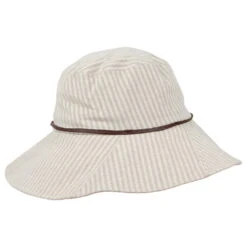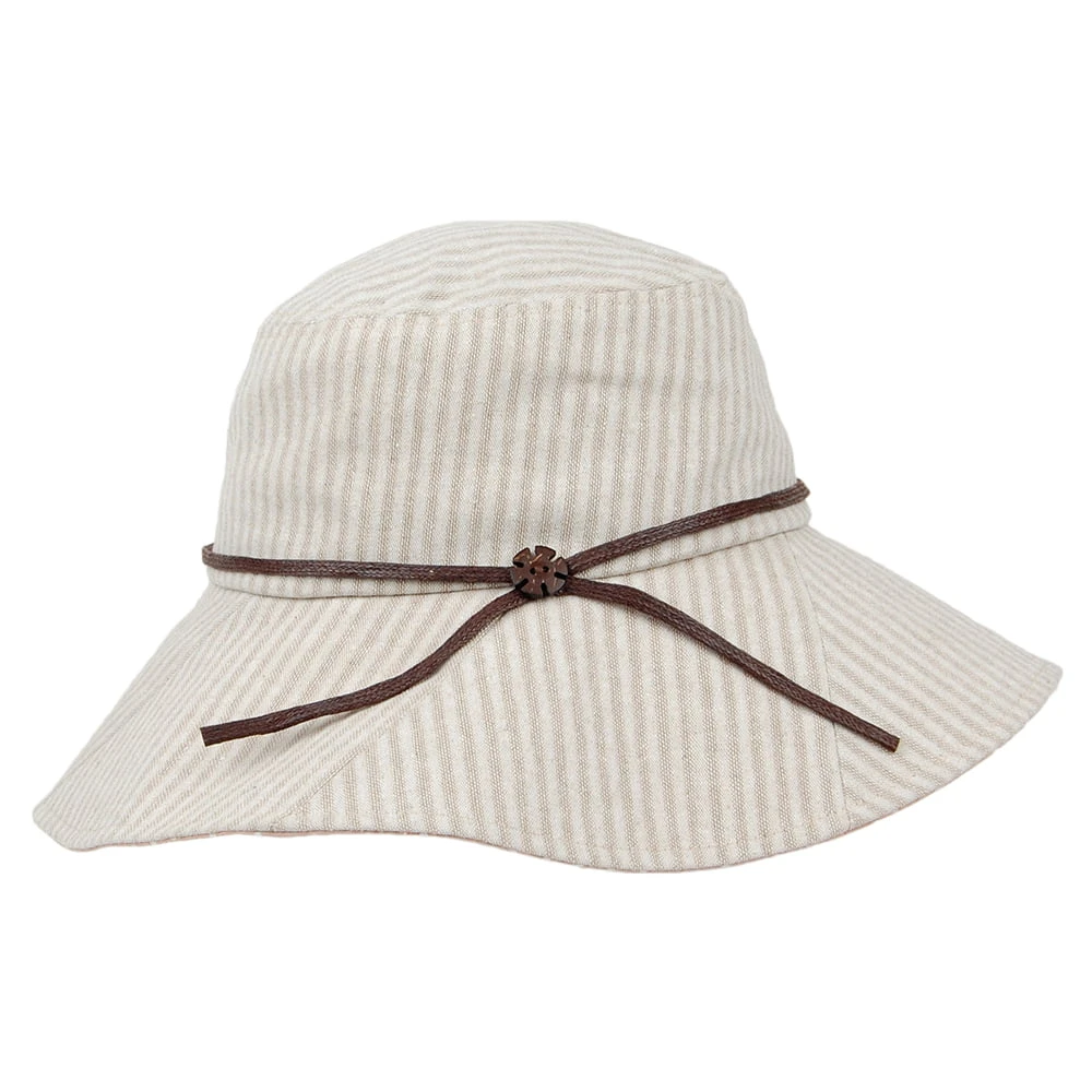 The sur la tête Soleil Sunhat in beige is a flirty and casual hat that is fun and fashionable. The 10cm high square crown has 10cm wide brim, with a matching cotton polka dot underbrim. The shadow stripe 100% cotton exterior shows a subtle hint of a pattern. Waxed cotton cord hat band with a carved wood value accent. The hat comes with cotton drawstring for easy sizing. This hat is not machine washable, we suggest spot cleaning only.