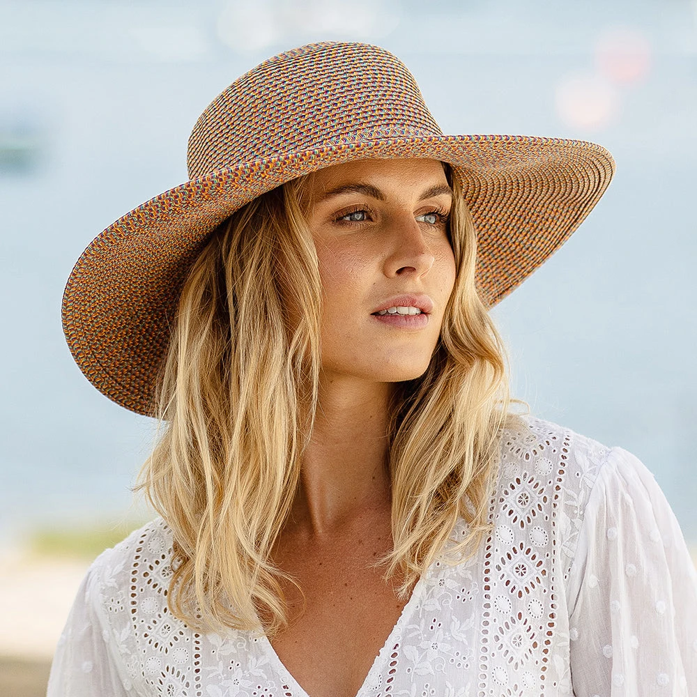 This is the multi coloured sur la tête Sorbet Sun Hat. The Sorbet is fantastically stylish! Featuring an assortment of bright colours through out the hats weave, it should just about match your entire warm weather wardrobe. Perfect for protection through out the whole summer. The 10cm wide brim will keep you shaded all day long!
