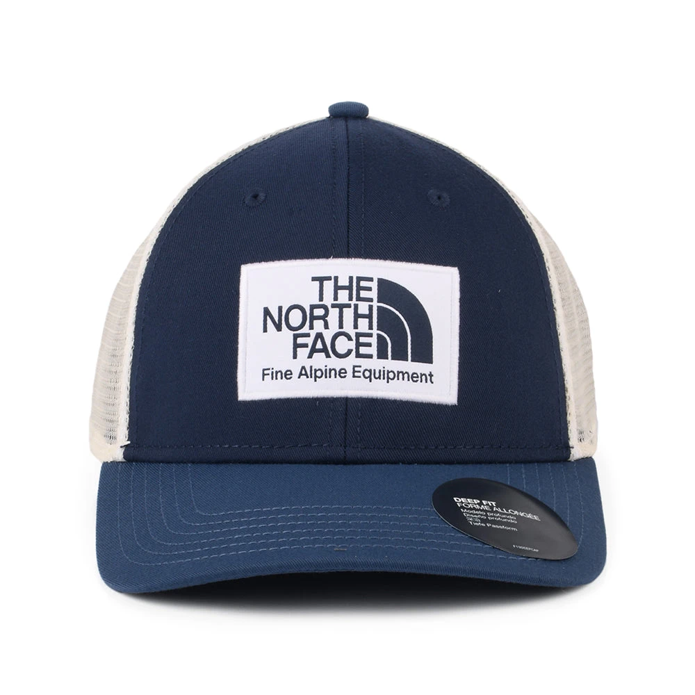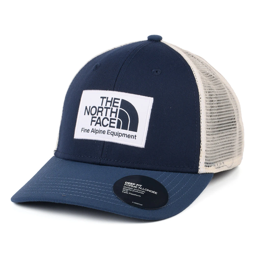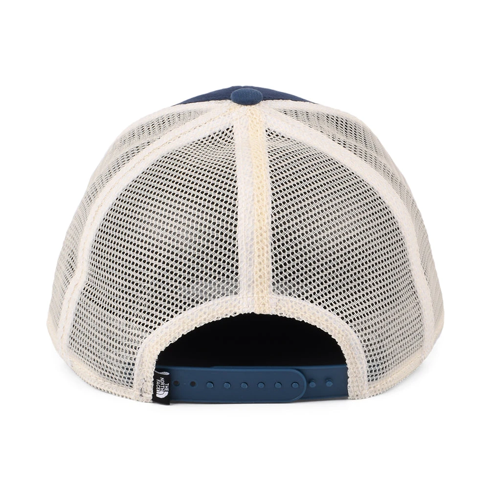 The North Face Mudder Deep Fit Trucker Cap in blue-white is a classic trucker style. The recycled front features a patch with The North Face logo and there is a mesh back to keep you cool on a warm day. This hat has a deeper fit than a standard hat from The North Face. There is an adjustable snap at the back to ensure a great fit.