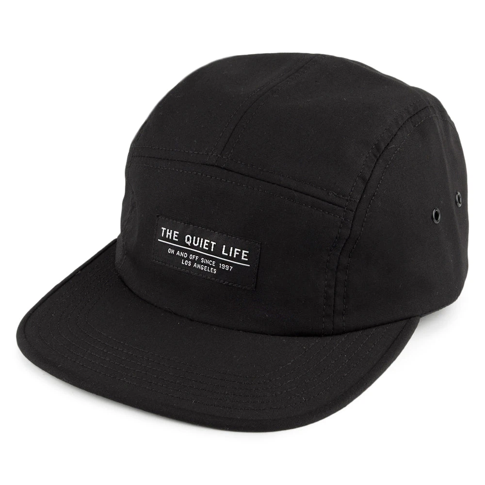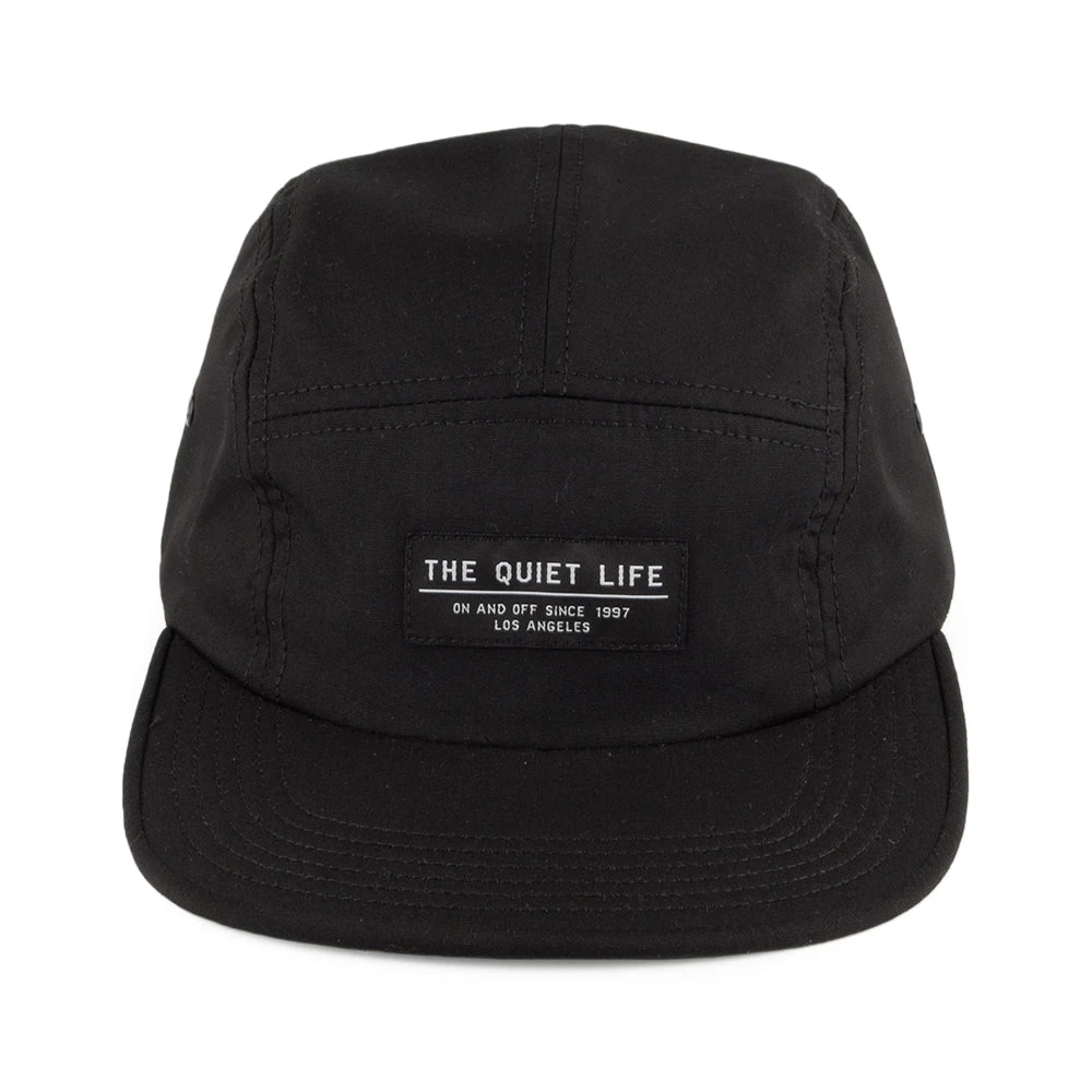 The Foundation 5 panel cap in black from The Quiet Life is one of their classic styles. This poplin cotton cap features a simple design on the front of the cap, eyelets on the side for ventilation, and an adjustable strap at the back so it fits most sizes comfortably. There is also a flip tag attached to the strap back.